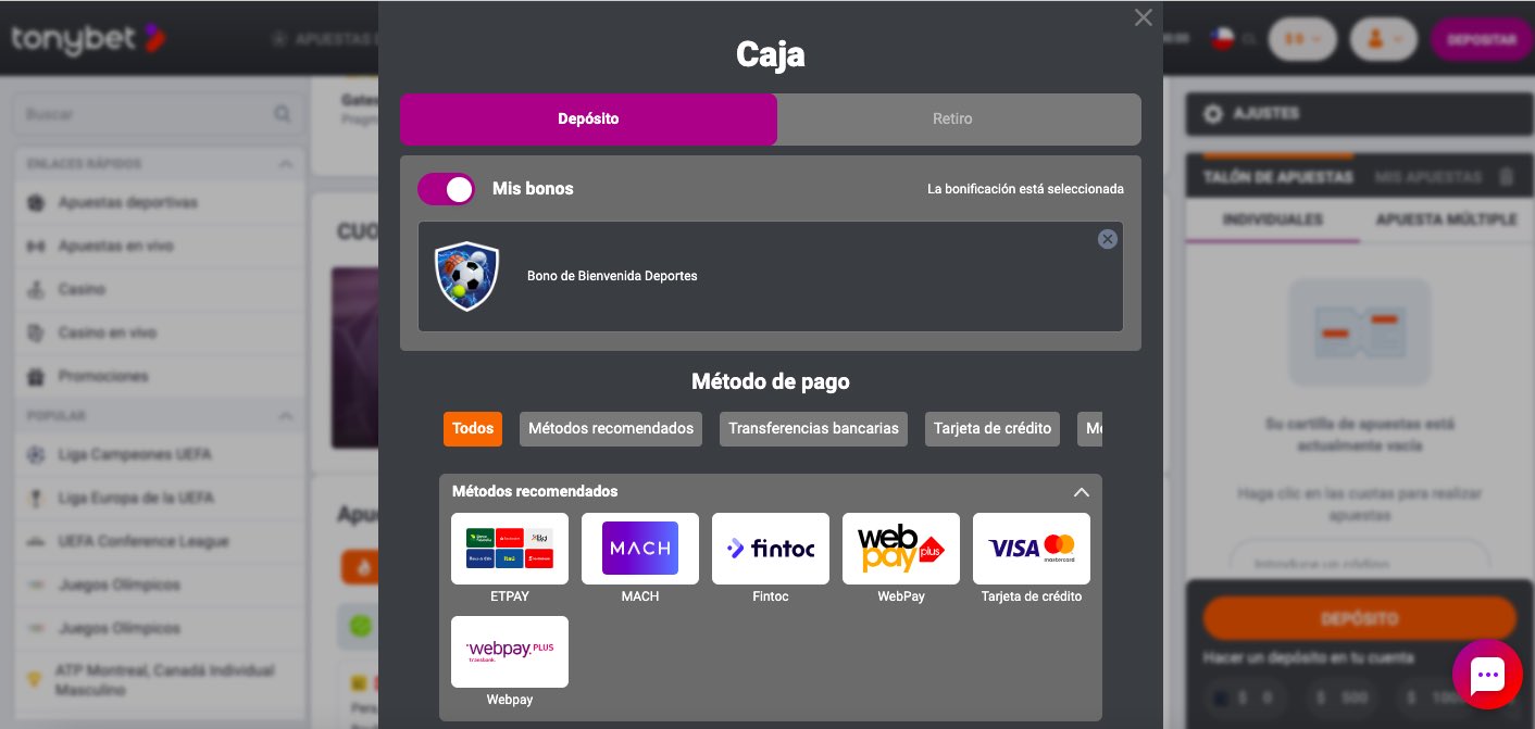 A la hora de ingresar dinero a tu cuenta de Tonybet, puedes hacerlo con Etpay, Mach, Fintoc, WebPay, tarjetas de crédito, transferencias bancarias, monederos electrónicos (Neteller, Skrill, MiFinity, MuchBetter) y criptomonedas.